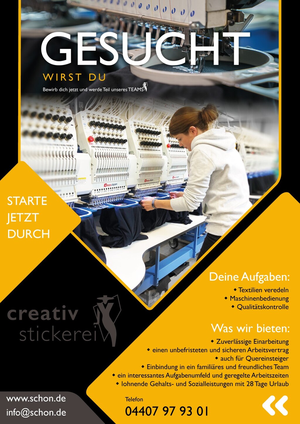 Die Creativ Stickerei GmbH ist aus einem Familienunternehmen zu einer der modernsten Stickereien Europas geworden. Wir konzentieren uns auf die Veredelung von Textilien durch folgende Veredelungsmethoden: Stickerei, Flockdruck, Flexdruck, Transferdruck, Lasergravur.